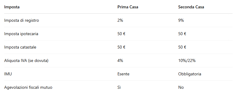 La principale differenza tra le tasse per la prima e la seconda casa riguarda l’imposta di registro, che passa dal 2% al 9%, e l’esenzione o meno da IMU e altri contributi annuali. Riassumiamo le principali voci: